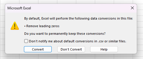 - When prompted to "remove leading zeros", select the "Don't convert" button. The prompt will show like below: